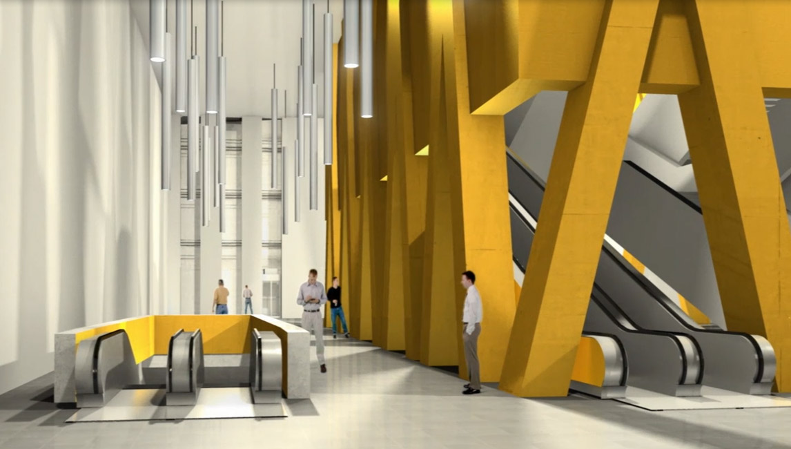 Angesichts der prognostizierten hohen Fahrgastzahlen ist ein gleichzeitiges Ein- und Aussteigen der Fahrgäste vorgesehen, die sogenannte spanische Lösung. Zum Einstieg wird zwischen den beiden Gleisen ein rund 14,70 Meter breiter Bahnsteig gebaut, zum Ausstieg an jedem Gleis zusätzlich je ein Außenbahnsteig. Von der Station kann die Innenstadt über den zentralen Hauptzugang mit Aufzügen und Rolltreppen schnell erreicht werden. Über Verbindungstunnel gelangen die Fahrgäste zudem zu den U-Bahn-Linien U 3 und U 6.