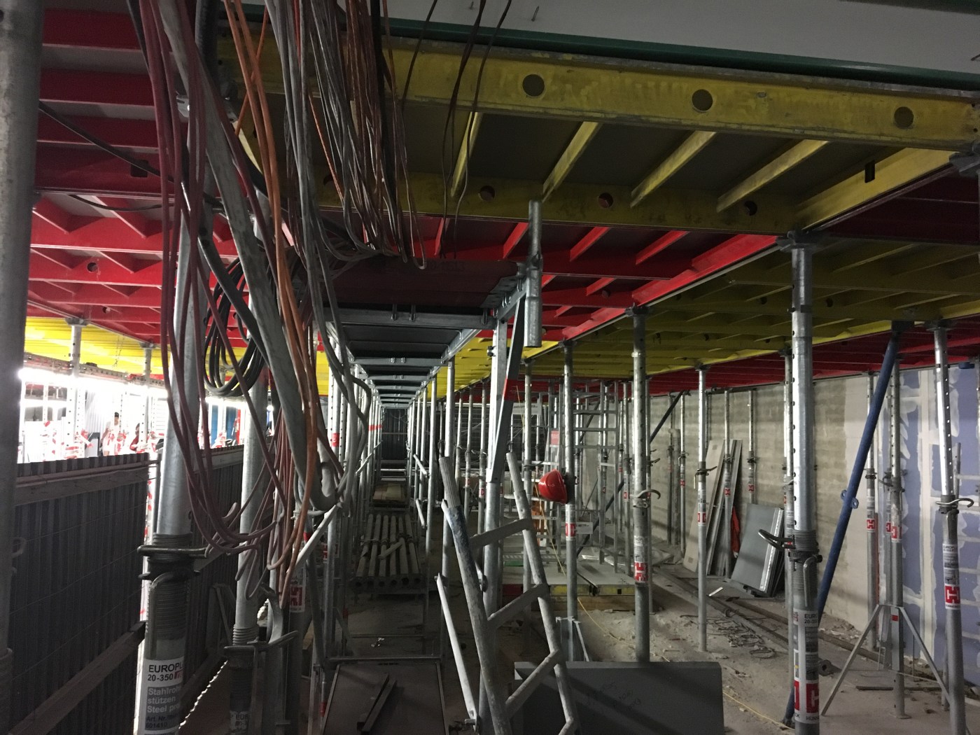 Viele Stangen im Sperrengeschoss stützen die Decke, dort, wo früher die kleinen Ladengeschäfte waren.