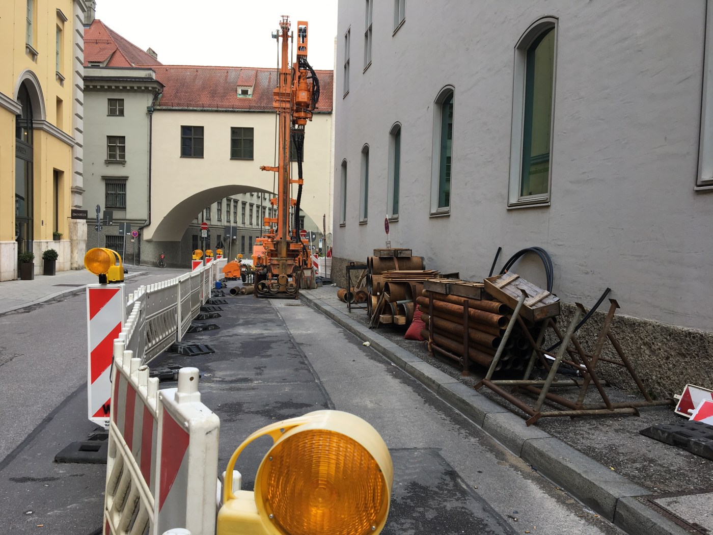 Vor dem Seiteneingang des Kaufhauses Lodenfrey sind die Spuren der Bohrungen bereits wieder vollständig beseitigt. Zwischen den beiden Probebohrungspunkten erstreckt sich später die Station Marienhof.