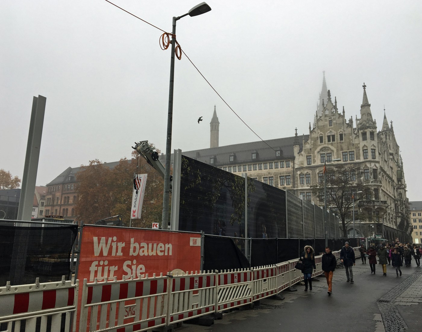 Stück für Stück entsteht am Marienhof rund um die Baustelle der zweiten Stammstrecke die Schallschutzwand. Bei herbstlichem Nebel schaut der Blick auf die Baustelle grau und trist aus: