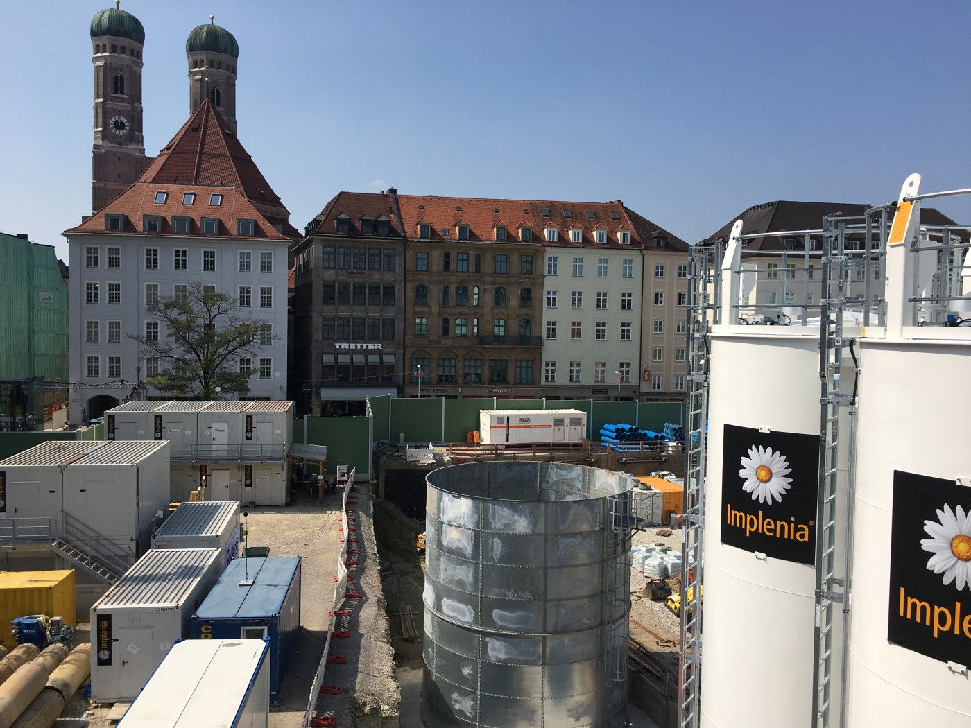 Der Marienhof in München füllt sich mehr und mehr mit Maschinen, Silos und Baumaterial. Noch vor dem Oktoberfest geht es richtig los. Die Silos für das Bentonit, einer tonartigen Masse zur Abdichtung der Frässchlitze, stehen bereit. In der ersten Septemberwoche soll es mit dem Fräsen testweise losgehen, Mitte September soll dann der Regelbetrieb starten.