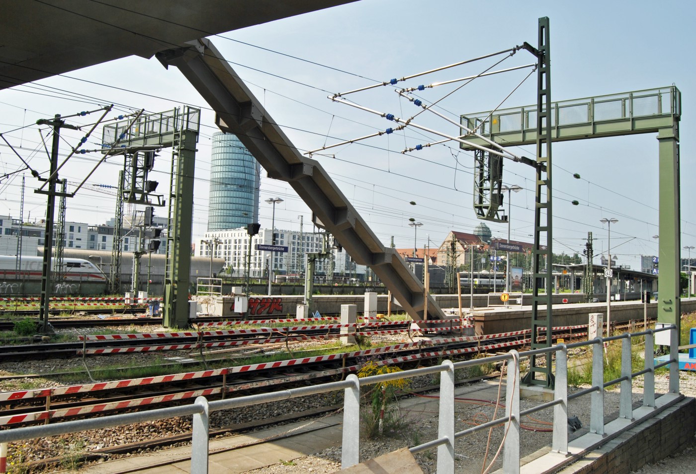 Am vorletzten Augustwochenende wurden die Treppen vom Arnulfsteg zur Station Donnersberger Brücke montiert. Die beiden jeweils 30 Tonnen wiegenden Treppenkontruktionen wurden am Ende der beiden Bahnsteige angebracht. Ganz wie geplant klappte es am Samstag nicht. Der Aufsatzpunkt am Bahnsteig war zu hoch. Um dies auszugleichen, wurde ein kleines Stück von ihm herausgebrochen.