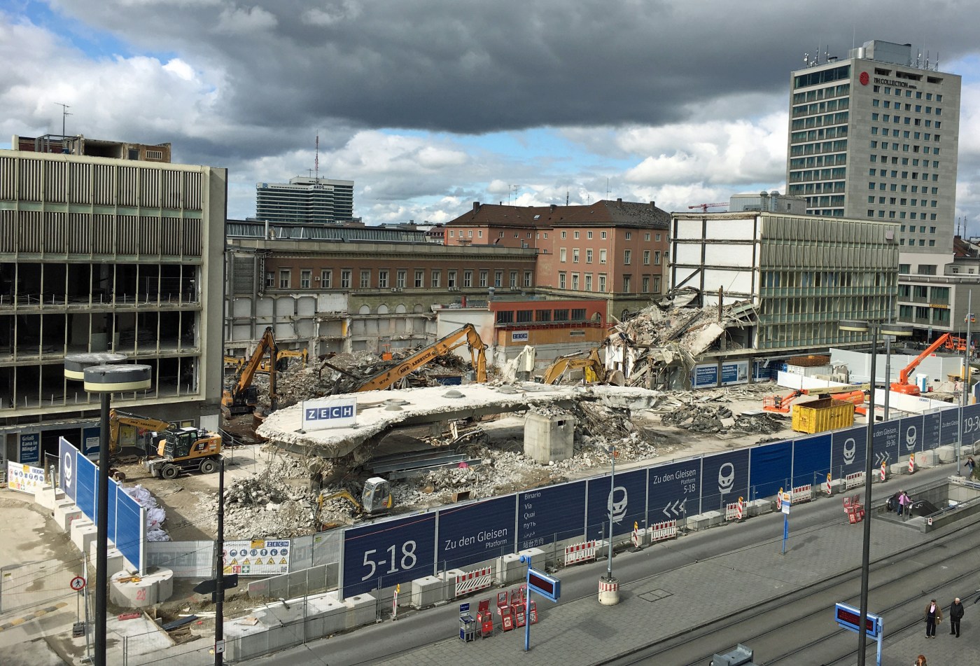 Auch in den vergangenen Tagen haben die Abrissarbeiten am Münchner Hauptbahnhof Fortschritte gemacht. Die Schalterhalle ist komplett zurückgebaut, jetzt folgen die angrenzenden Büroetagen. Nur noch anhand der Begrenzungswand lässt sich erkennen, wo früher tausende von Menschen durch den Hauptbahnhof gelaufen sind.
